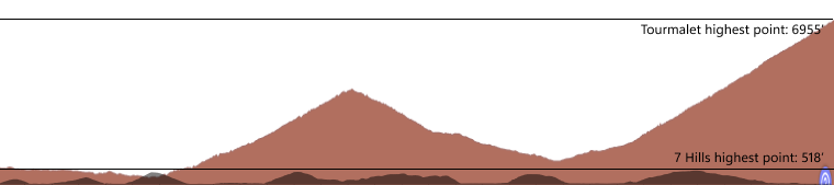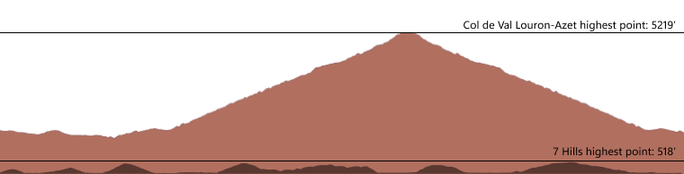 Here is 7 Hills compared to the other last three days of our tour, which include Col du Tourmalet, Col d’Aspin, Pla d’Adet and Col de Peyresourde