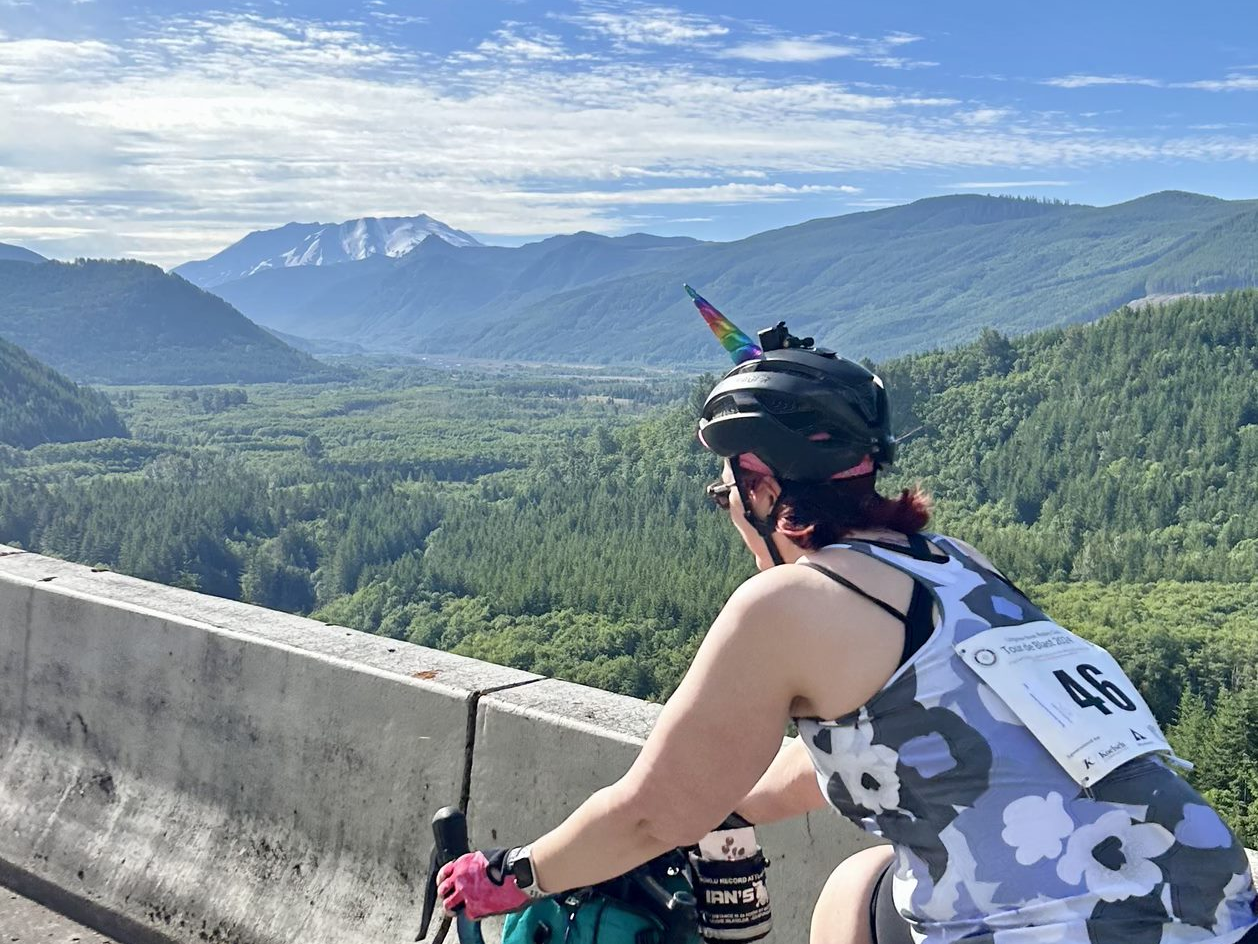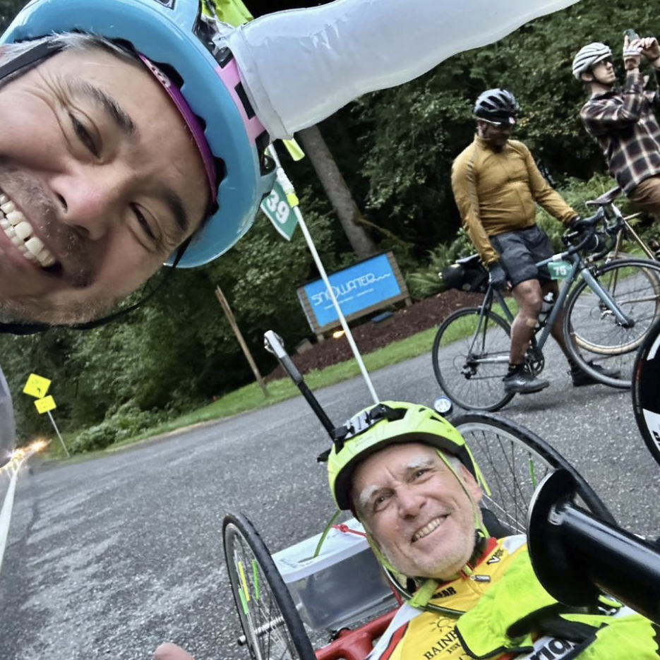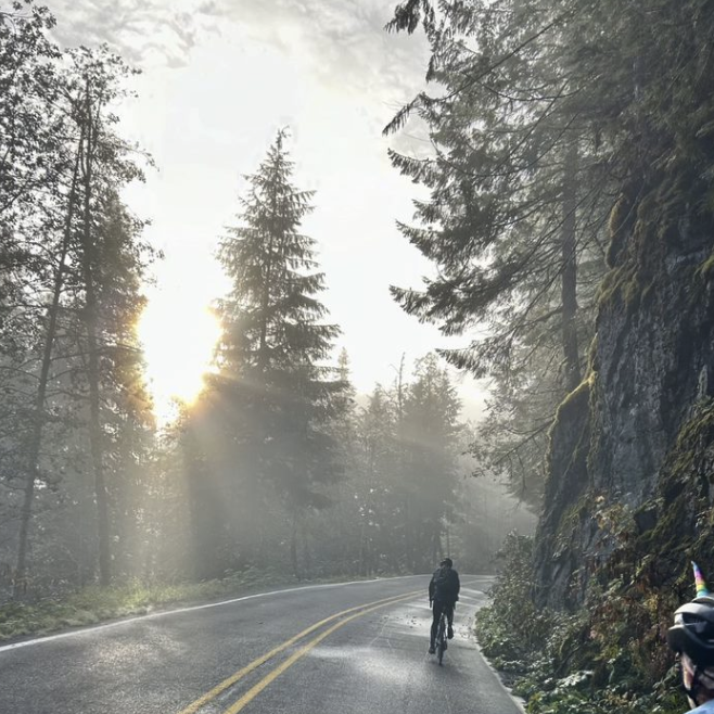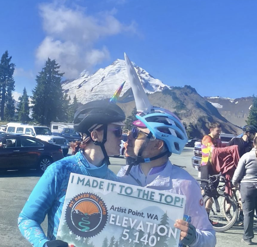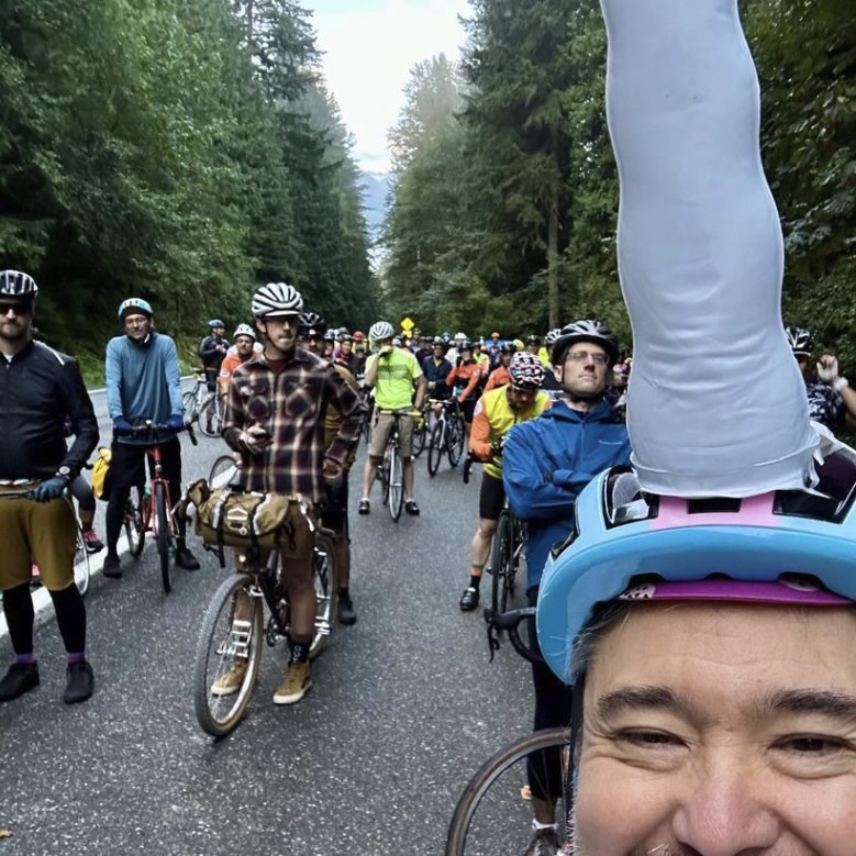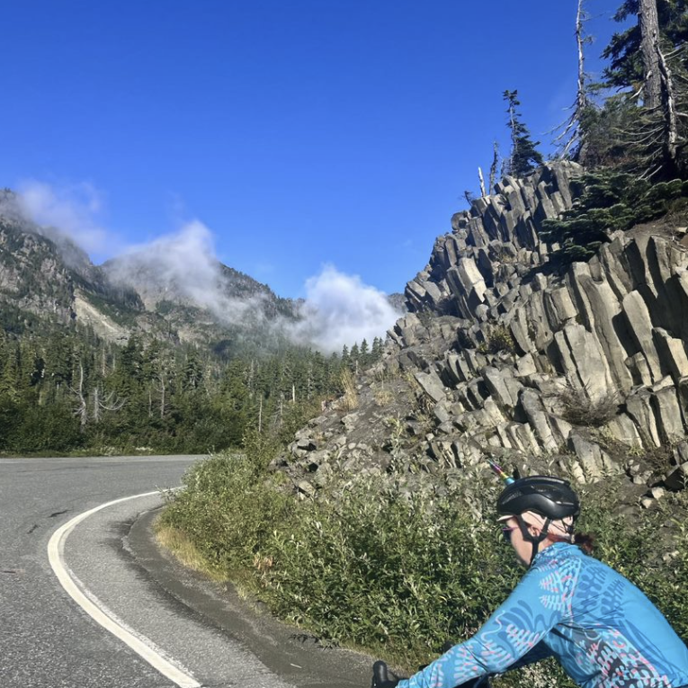 Mt. Baker Hill Climb was probably the most welcoming and beautiful ride out of all four. Unlike the other rides with volcanic peaks, you get TWO peaks for one. The ride actually goes between Shuksan and Kulshan (Baker), with alpine lakes on the way, much like RAMROD. How this ride differs from the others is that it’s an ACTUAL race. There are timing chips and people win awards at the top. It’s also a ride for anyone wishing to do it, regardless of locomotion. They do it with 3 divisions, each starting at separate times. The “Competitive” group starts last and has hosted former racers like Phil Gaimon. There’s a “race curious” “Recreational” group that starts 2nd, and “Social” that starts first. All e-bikes are social and the social event is not timed. A timing chip is given for everyone for safety reasons. They keep a count at each stop to make sure everyone is accounted for and safe.