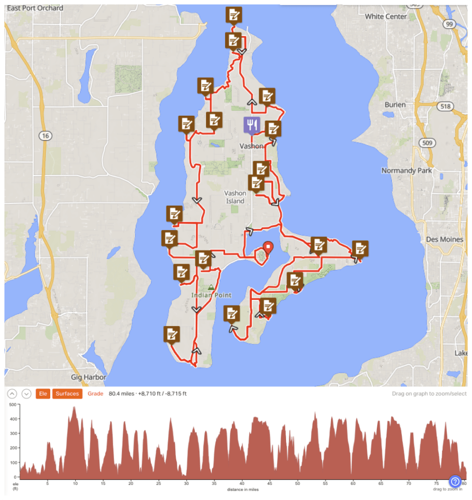 The year I did it they started doing it backwards. This will be a theme. They said it was because the ride was a teenager, which reflects their fun and irreverent take on a very hard challenge. It’s a fundraiser for Vashon Rowing Club and started when a group of them decided to ride the craziest, hardest route around the island. They have no allusions of glory and riders are deemed Idiots, Weasels, Weenies or Tourists, depending on how much pain you signed up for and continue to do. This makes it extremely inclusive for riders of most abilities and bike types.