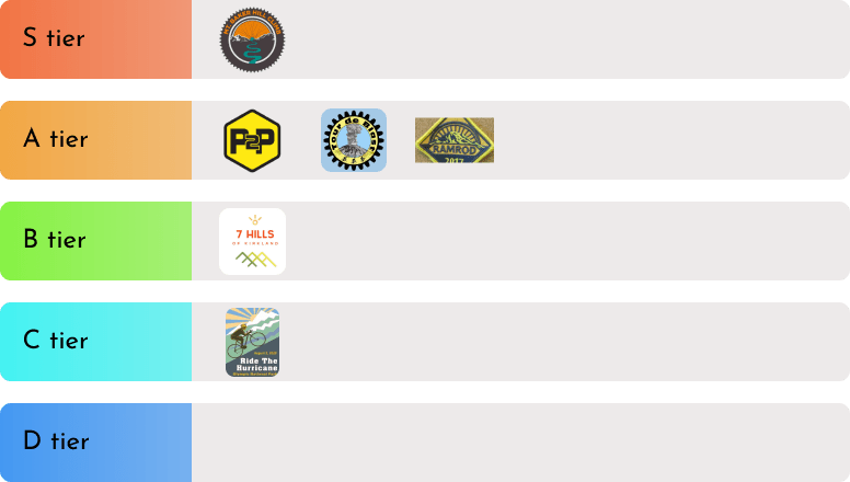 In A tier I put Passport 2 Pain, RAMROD and Tour de Blast. I am ranking these for their full potential, so considered Tour de Blast in its full glory up to Johnstone Ridge. Passport 2 Pain is likely the most fun ride I’ve ever been on, and 2nd in challenge here next to RAMROD. Snacks were great, and had a wide variety as much were supplied by individual climb sponsors. The sandwiches were great and only one of two events that hand made them for you. With 4 “tiers” in itself, it had something for everyone.